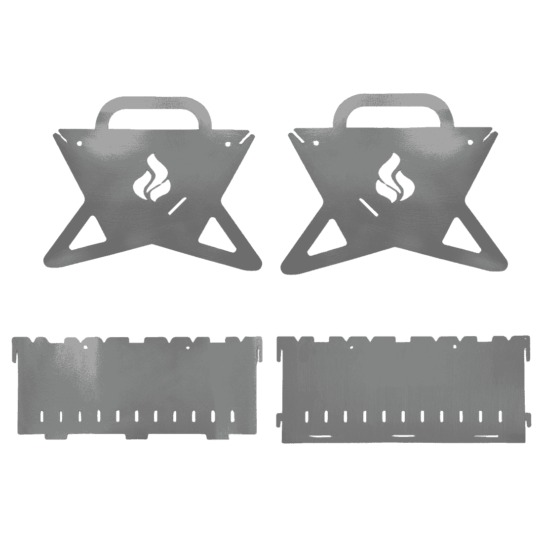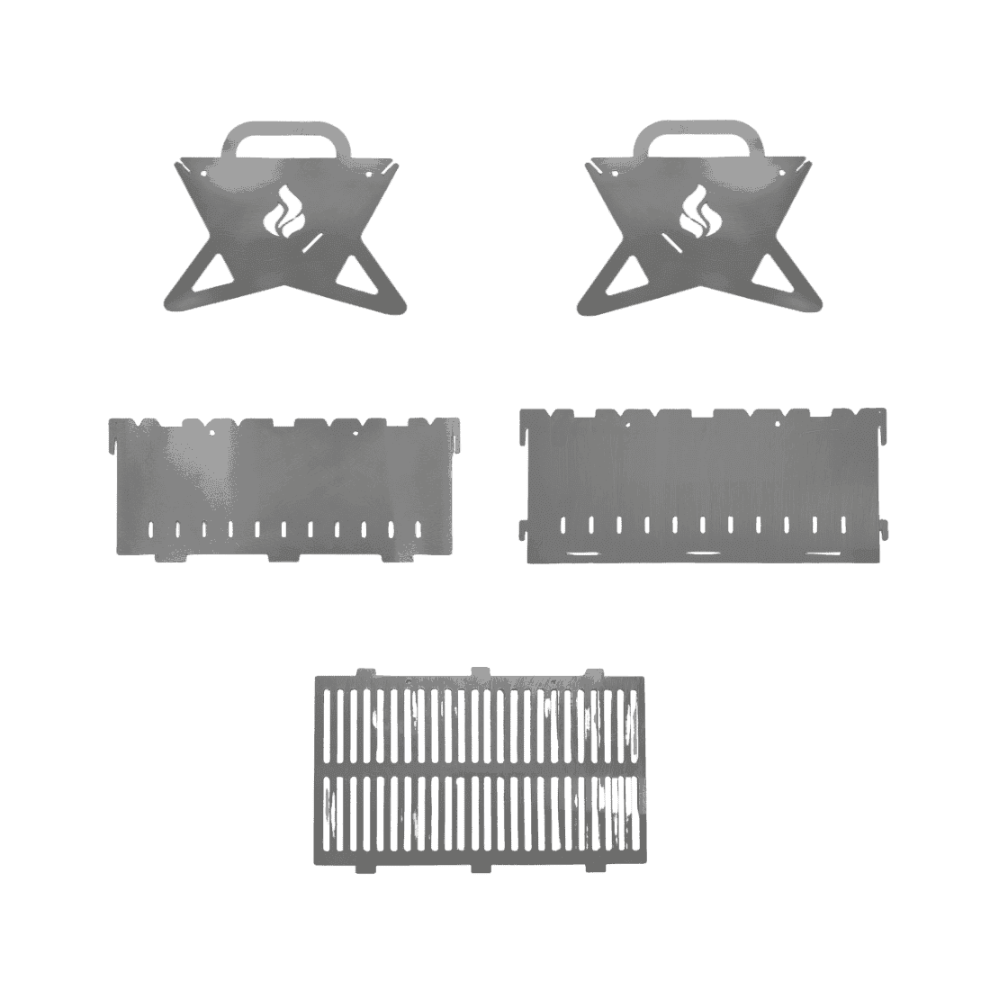 This flat-pack bbq set includes 2 side plates, 2 base plate and grill, all made of 3mm mail steel or high grade 3mm stainless steel able to withstand high temperatures. They are super easy to assemble as they just slot together! Additionally,stored in a durable ripstop vinyl bag or wooden chopping board box.